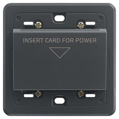 Interruttore elettronico a badge, tasca verticale, uscita a relè 16 A 230 V~, alimentazione 230 V~ 50-60 Hz, completo di supporto per installazione in scatole quadrate BS, da completare con placca 3 moduli BS, grigio. Fornito senza carta ISO (badge).