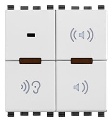 Microfono per chiamata selettiva o generale, funzione di attivazione con la voce per il controllo dei bambini (Baby Control) e ascolto ambientale - 2 moduli. Il dispositivo permette di rilevare e trasmettere sul bus del sistema di diffusione sonora il segnale vocale captato dal microfono frontale in modo da attivare le funzionalità di Chiamata Generale, Chiamata Selettiva, Baby-Control o Ascolto Ambientale. In caso di chiamata le zone coinvolte diffondono il segnale audio relativo alla chiamata stessa; al termine di quest’ultima ogni zona riprende il funzionamento immediatamente precedente alla chiamata. Il tasto basculante destro inoltre, può anche essere configurato per effettuare funzioni diverse da quelle standard di Chiamata Generale e Selettiva e può essere utilizzato come comando automazione (controllo luci, tapparelle, ecc.) o per altre funzioni audio legate alla diffusione sonora. Bianco.
