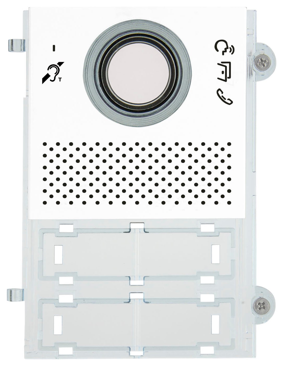 Modulo frontale audio/video, Pixel, per unità elettronica audio/video Due Fili Plus 41004, con funzione audiolesi e simbolo teleloop, bianco.