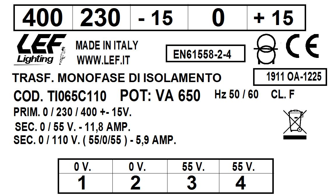L.E.F. SRL - LEFTI065C110 TRASFORMATORE MONOFASE 650VA 230.400V / 55÷110V