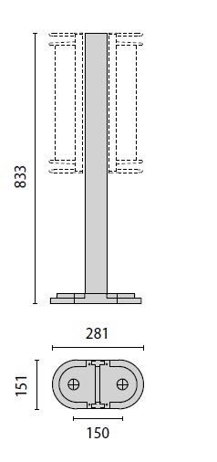 Palo 45 H800 costituito da: Palo in alluminio estruso verniciato predisposto per alloggiare uno o due apparecchi. Base di fissaggio a terra in alluminio pressofuso verniciato. Scatola di derivazione in alluminio pressofuso con morsetto a 4 poli 4 mm2 predisposta per collegamento in cascata. Colore: Grigio.