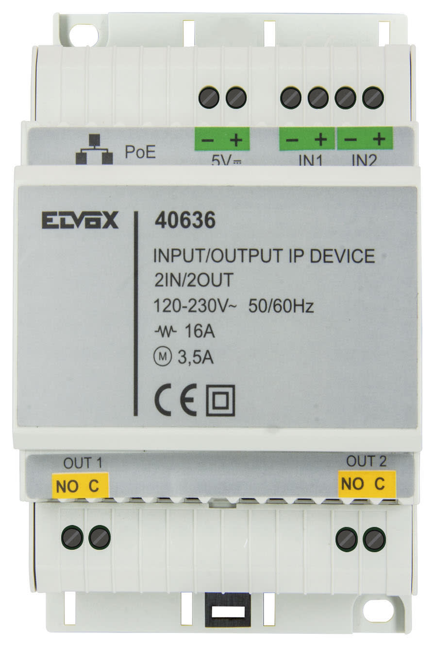 Dispositivo con due ingressi/uscite, standard IP, 2 uscite a relè 6 A 230 V~, 2 ingressi, alimentazione PoE o 5 Vdc, installazione su guida DIN (60715 TH35), occupa 4 moduli da 17,5 mm.